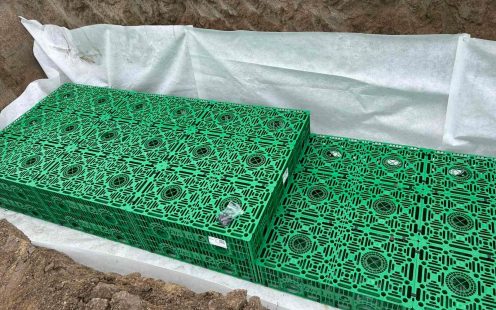 Атмосферните води от площ приблизително 2000 кв.м на обекта в Пловдив са заустени в дренажна система, изградена с блокчета Stormbox I. Системата е проектирана да поема пикови оттоци при интензивни валежи и да осигурява равномерно разпределение и контролирано изпускане на водата, предотвратявайки повърхностно наводняване и ерозия.